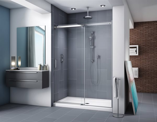 The Apollo collection features 48" or 60" alcove shower doors, available in Chrome, Brushed Nickel or Matte Black, paired with a matching acrylic shower base from Fleurco for a seamless and elegant finish.